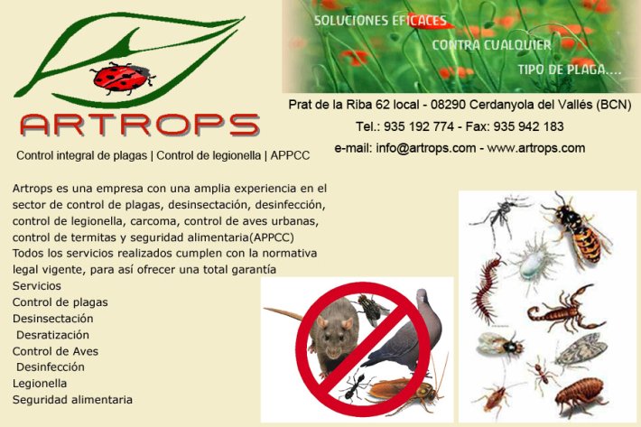ArtropsServeisArtropsControl de Plagues a Cerdanyola del VallèsAdreça:Prat de la Riba 62 local Cerdanyola del VallèsXarxes socials:Telèfon:935192774Pàgina web:http://www.artrops.comCorreu electrònic:info@artrops.comTambé et pot interessar:Family Laundry CerdanyolaCerdanyola del VallèsServeisMudances PerePalafrugellServeisPerfollacBanyolesConstrucció i reforma, ServeisLineshaVicServeisCentre de dia Can TinetGranollersSalut, ServeisEstela ServeisGranollersServeisLoteria Les Termes Caldes de MontbuiCaldes de MontbuiServeisFamily Laundry CerdanyolaCerdanyola del VallèsServeisCodina MaquinàriaGranollersFloristeries, jardineries i mascotes, ServeisManufactures IsartSant Esteve de SesroviresServeisRidox DecoracióSant Cugat del VallèsLlar i Decoració, ServeisBugaderia a RemullLlinars del VallèsServeis