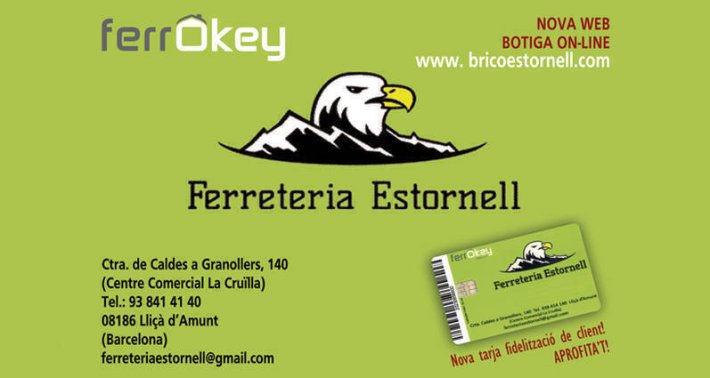 La Ferreteria Estornell de Lliçà d’Amunt és un comerç de referència on trobar-hi eines, material de bricolatge, electricitat, fontaneria, ferreteria industrial i articles per a manteniment de la llar. Disposen d’un ampli assortiment i assessorament proper perquè cada client trobi el producte adequat, tant si és per a una reparació ràpida com per a un projecte més exigent.