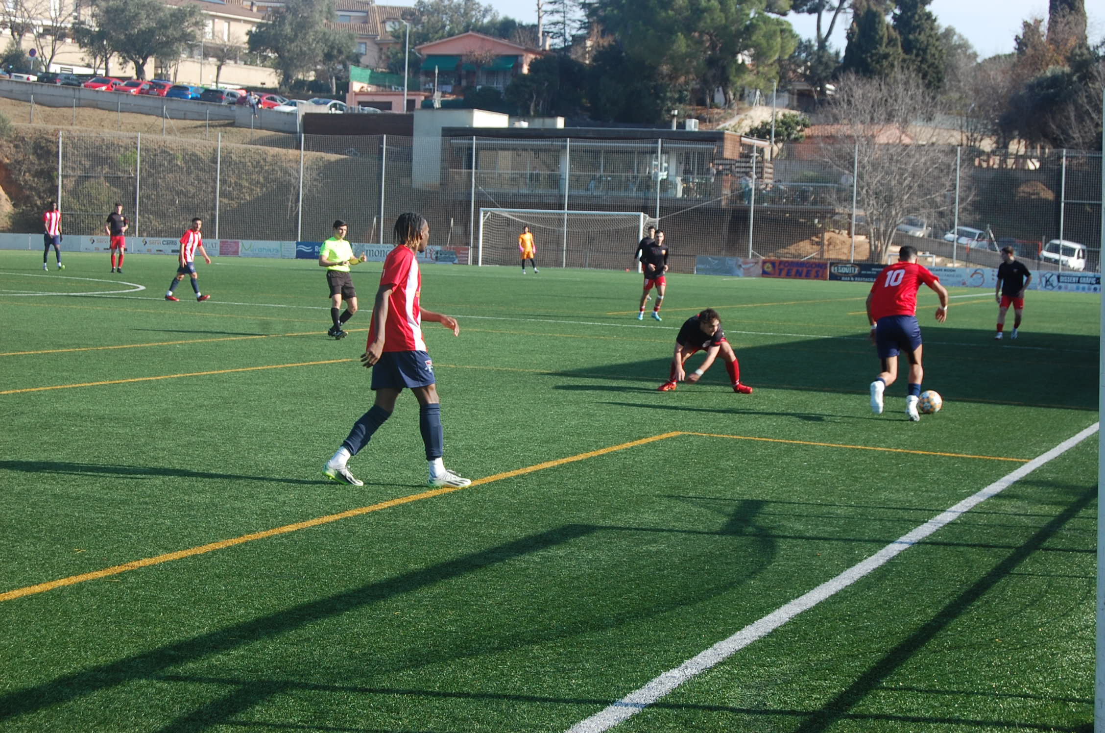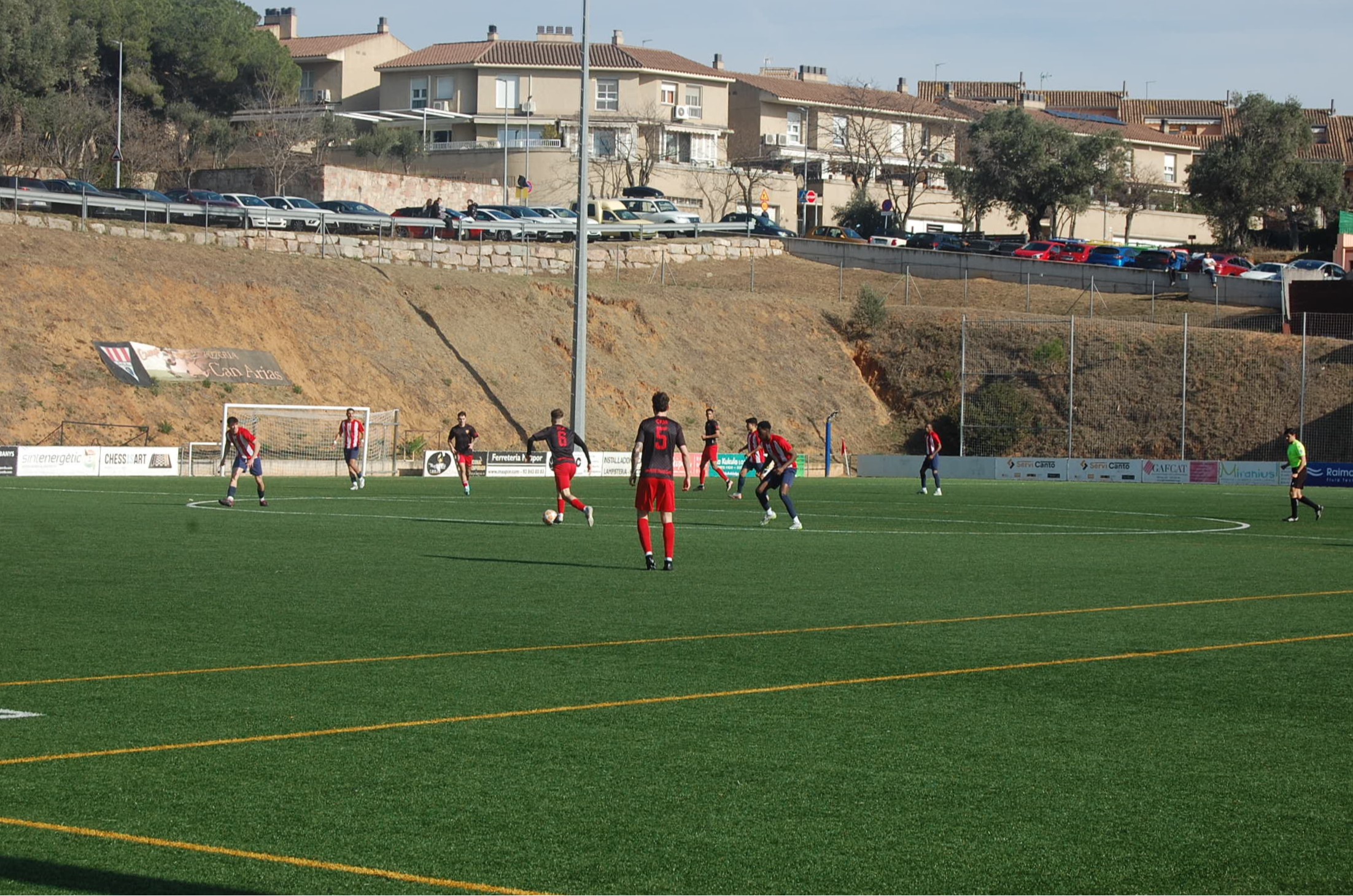 La primera part va començar amb un ritme frenètic, i ja al primer minut, en una brillant combinació, Mady Traore va filtrar una passada per Quim Fornell, el màxim golejador de la categoria, que va definir amb encert per avançar el conjunt local. Tot i moments de tensió amb ocasions per a ambdós equips, els porters van destacar evitant un marcador més ampli. Abans del descans, al minut 42, una jugada magistral amb un llançament llarg de Víctor Gragera, una pentinada de Mady Traore i una precisa definició de Quim Fornell van permetre al conjunt local ampliar la diferència.