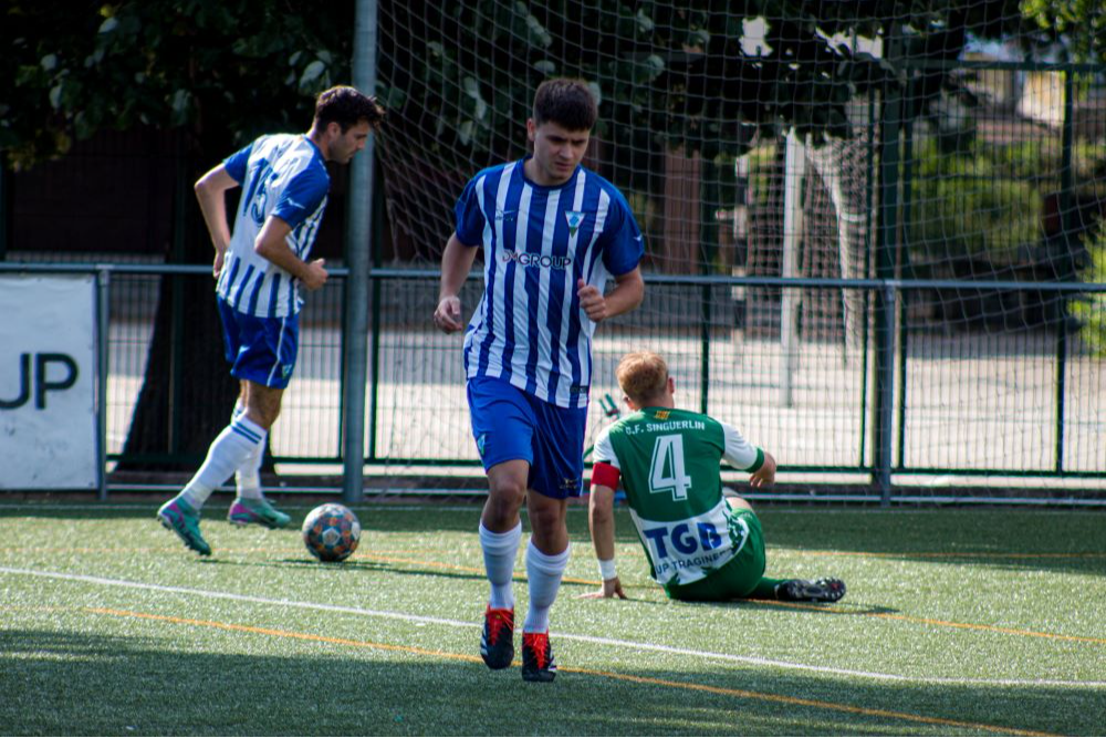 El partit va començar amb un ritme lent, amb possessions llargues per part dels dos equips, però sense generar perill. Sota una calor intensa, el joc es va desenvolupar majoritàriament al mig del camp, amb poques ocasions clares. El Singuerlin, ja coronat campió de lliga, es va mostrar pacient i segur amb la pilota, esperant la seva oportunitat. Aquesta va arribar al minut 40, quan una errada defensiva dels vallesans va permetre a Marc Adalid robar la pilota i centrar per Guillem Aguilar, que va marcar el primer gol del partit. Just abans del descans, el Singuerlin va tenir una altra gran oportunitat amb un xut de Marc Adalid que va ser aturat per una magnífica intervenció del porter Sergio Alfaro. Tot seguit, Álvaro Rubio va tenir la millor ocasió del Molletense a la primera part amb un intent de vaselina que va sortir fora per poc. El partit va arribar al descans amb un marcador de 0-1 en favor del Singuerlin.