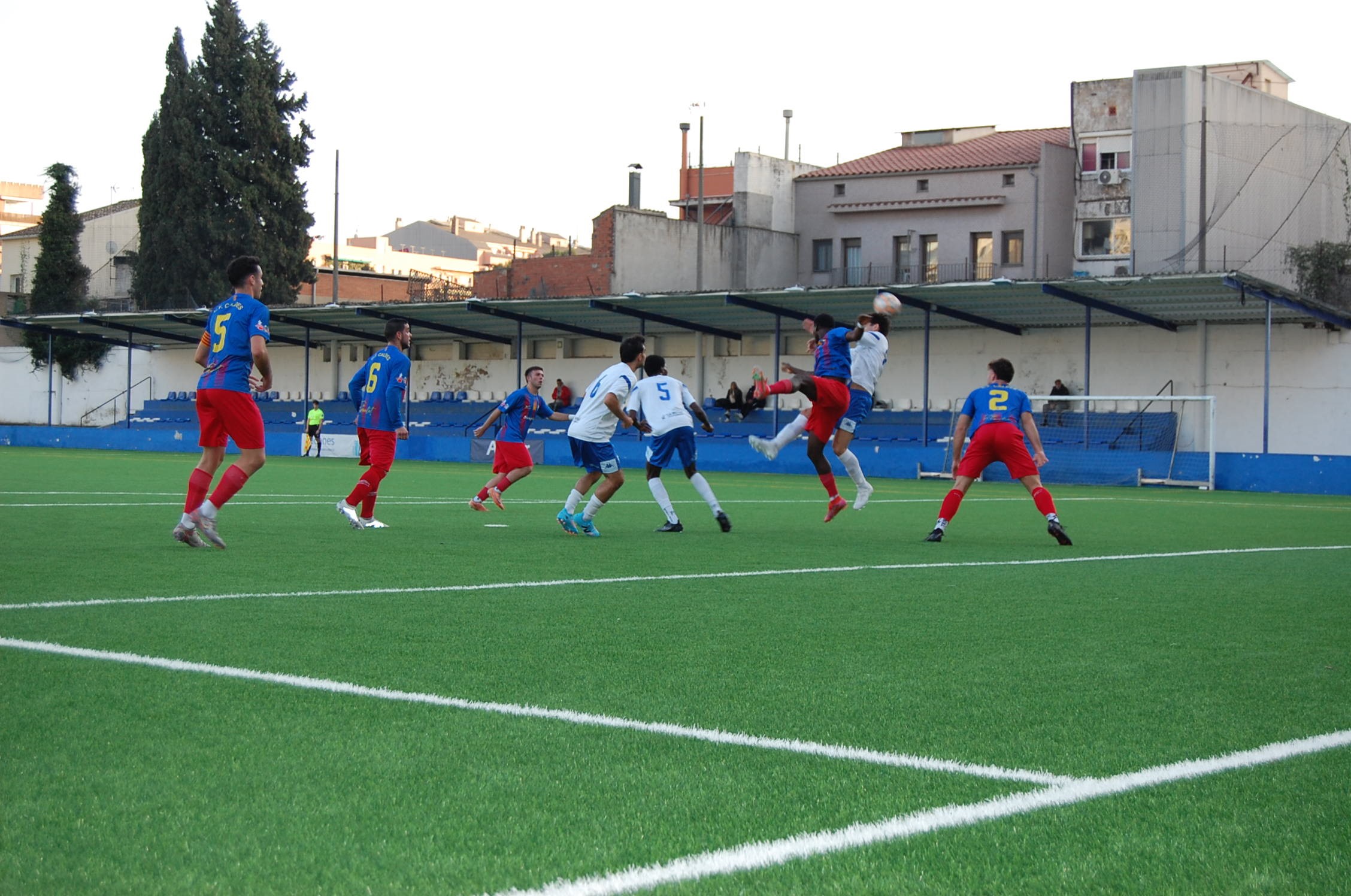 Els locals van començar amb domini de la possessió i futbol ofensiu. Al minut 21, el Granollers va tenir la seva ocasió més clara: un centre-xut de David Reyes rematat per Adrià Balagué que va acabar al travesser. Però el Caldes no va trigar a reaccionar. Al minut 25, un doble pal va estar a punt d’avançar els visitants, amb un xut d’Eric Ambrosio i una jugada posterior de Marc Angelet que també va impactar al pal.