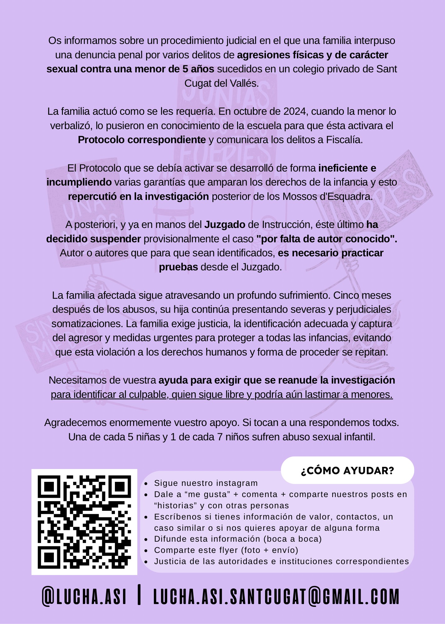 L'impacte psicològic en la nena continua sent profund, segons relaten els familiars, amb símptomes de somatització greus. Per aquest motiu, insisteixen en la necessitat de reprendre la investigació, fer les proves pertinents i esclarir els fets per garantir justícia i seguretat.