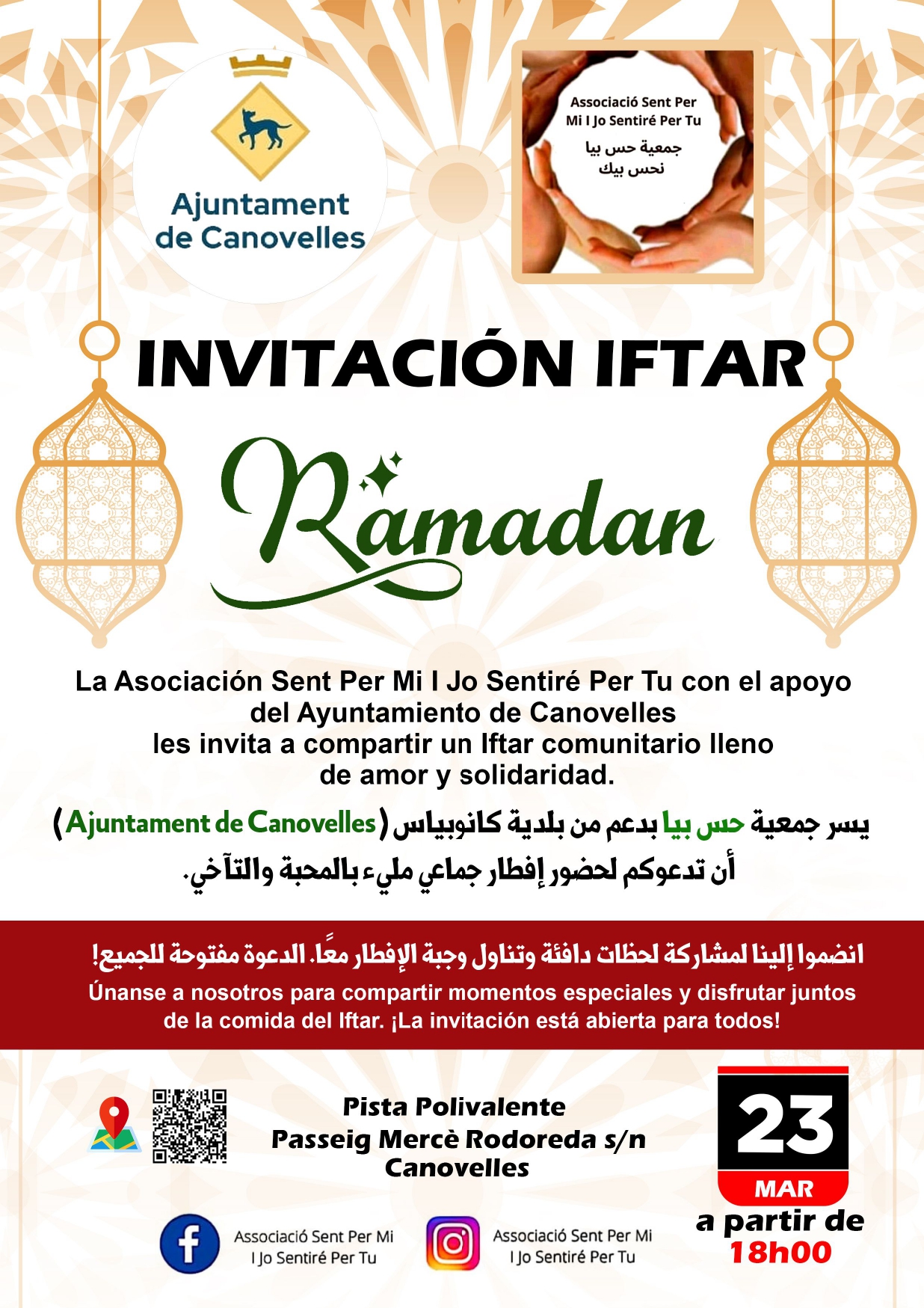 La comunitat musulmana de Canovelles convida un any més tota la ciutadania a participar en l’Iftar popular, un àpat que marca la fi del dejuni diari durant el mes sagrat del Ramadà. L’acte se celebrarà el pròxim diumenge 23 de març, a partir de les 18:00 h, a la Pista Polivalent, i és organitzat per l’entitat ‘Sent per mi i jo sentiré per tu’ amb el suport de l’Ajuntament de Canovelles.
