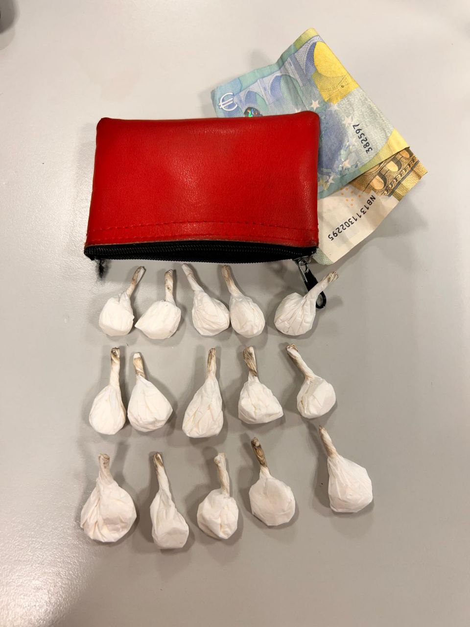 En escorcollar-lo, els agents li van localitzar a la mà bitllets arrugats per valor de 25 €, així com 15 bossetes amb una substància presumptament cocaïna, amb un pes total d’11,1 grams, preparades per a la seva distribució.