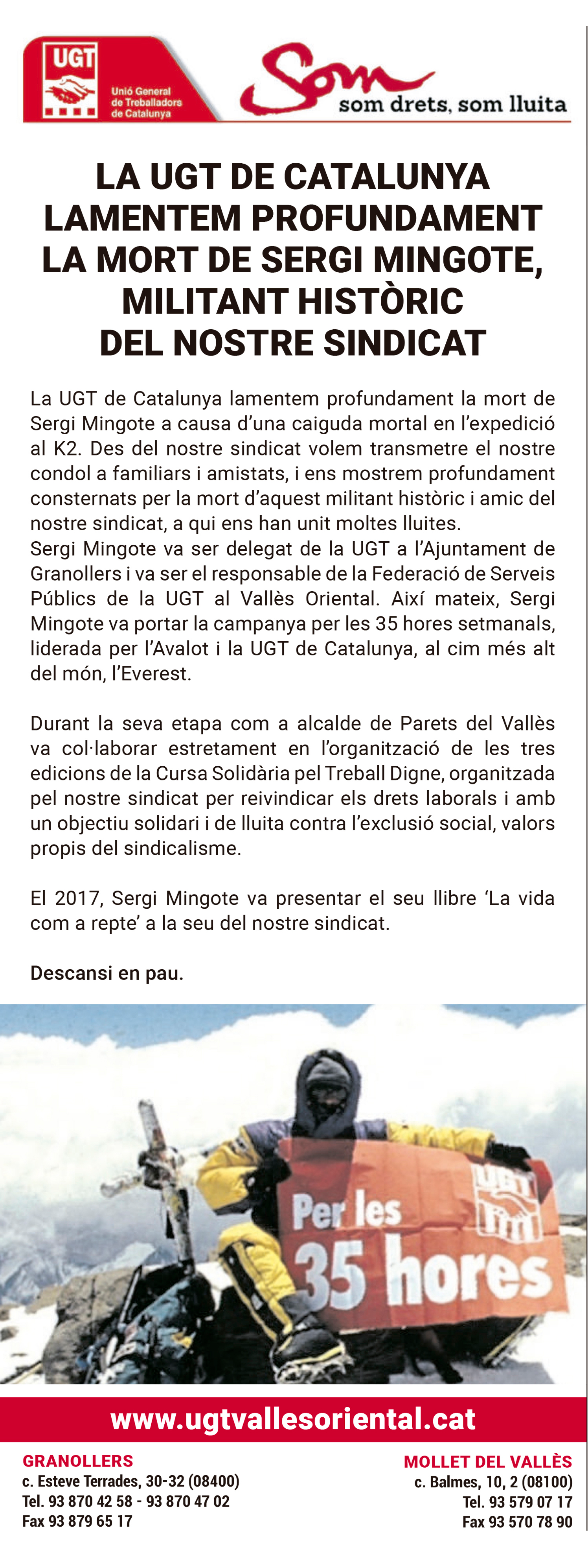 Per tot això, volem demostrar el nostre condol als familiars i amics d’en Sergi Mingote, un gran alpinista però sobretot un gran lluitador.